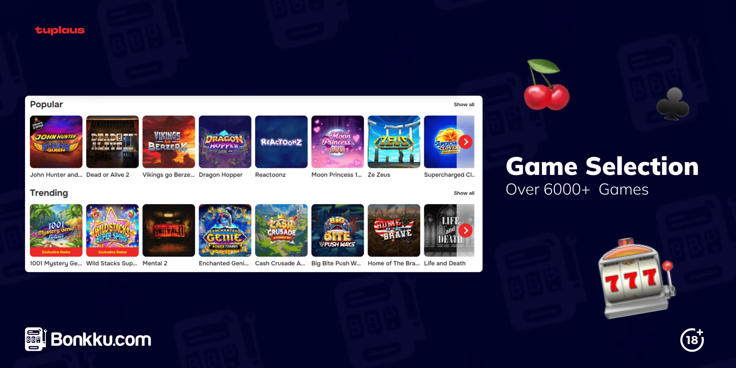 Tuplauksessa kerrotaan olevan noin 6000 peliä, mikä tekee valikoimasta erittäin laajan verrattuna moniin keskikokoisiin nettikasinoihin. Tarjolla on kolikkopelejä, livekasinopelejä, pöytäpelejä ja moderneja korkean volatiliteetin pelejä muun muassa studioilta Nolimit City, Quickspin, ELK Studios, Kalamba Games ja Evolution.
